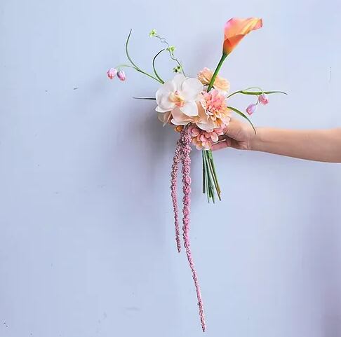 下に長く垂れさがったピンク色のお花がポイントのsmall size(小さめサイズ)で、小ぶりのブ―ケをご希望の方、和装の方にもお勧めです。