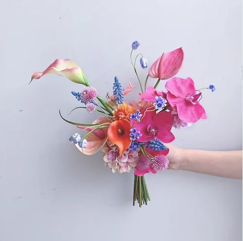 ブルーのお花がポイントで華やかな中にも可愛らしい雰囲気があるブーケです。