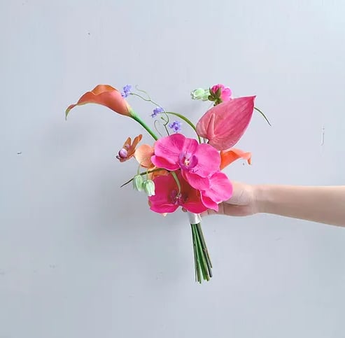 ビビットで濃いピンク・オレンジのお花でまとめた【造花】ブーケです。