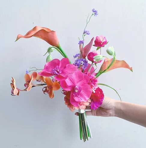 ビビットなピンク・オレンジから淡いアプリコットへグラデーション配色の【造花】ブーケです。